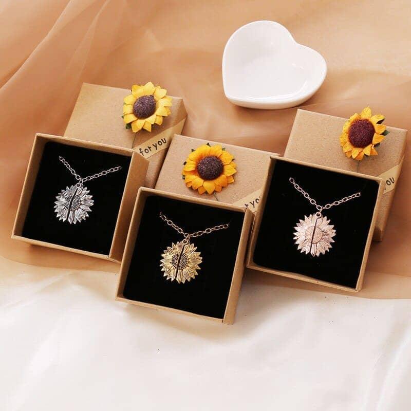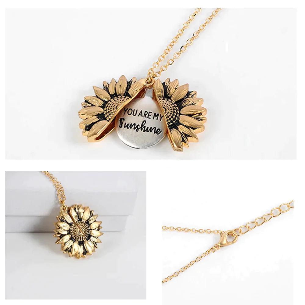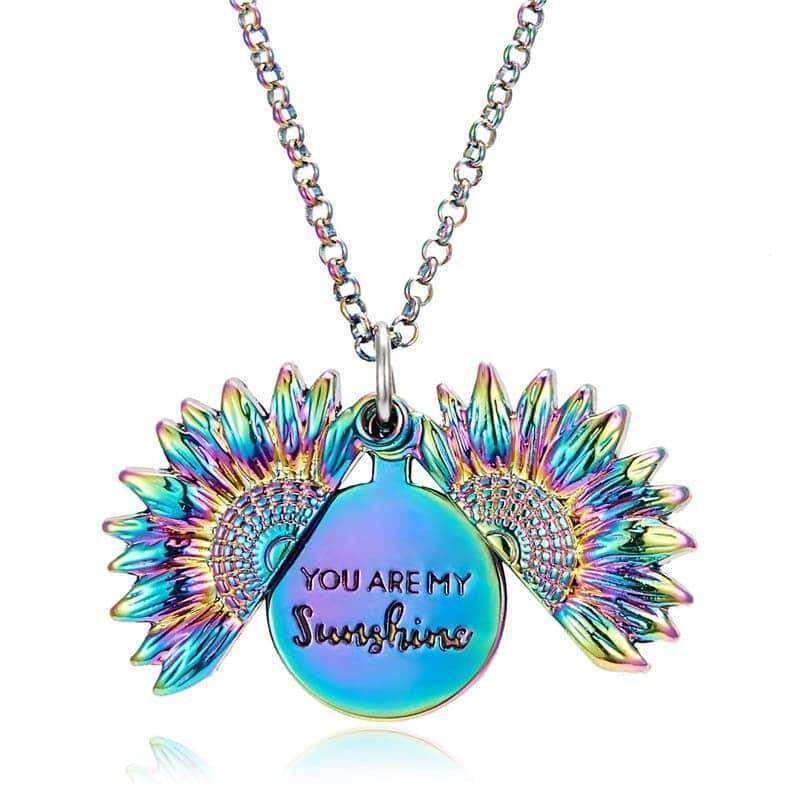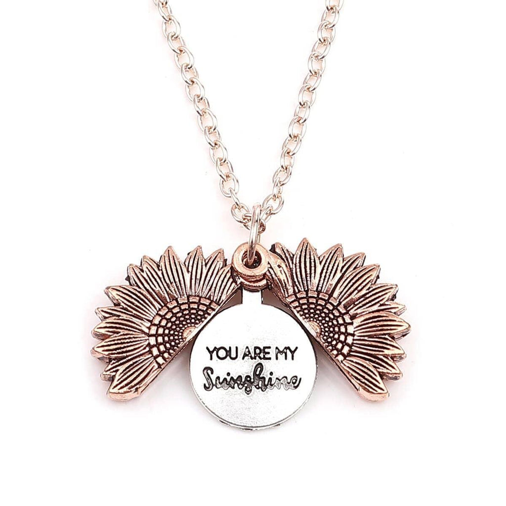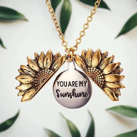 Delicado e bonito, o Colar Sunshine é feito em uma estrutura de Girassol que se abre revelando a frase "You are my sunshine" traduzido como ‘’Você é meu raio de sol’’.