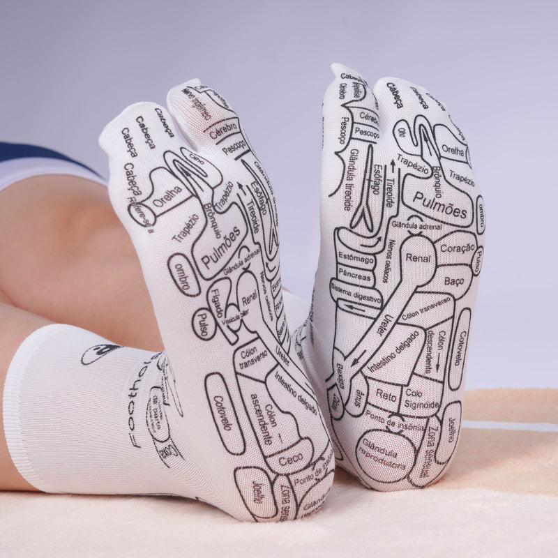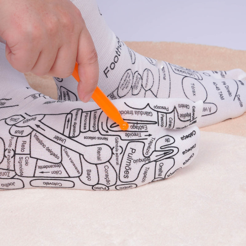 Simples de usar, basta calçar as meias e seguir o mapa reflexológico impresso para uma experiência completa de bem-estar.