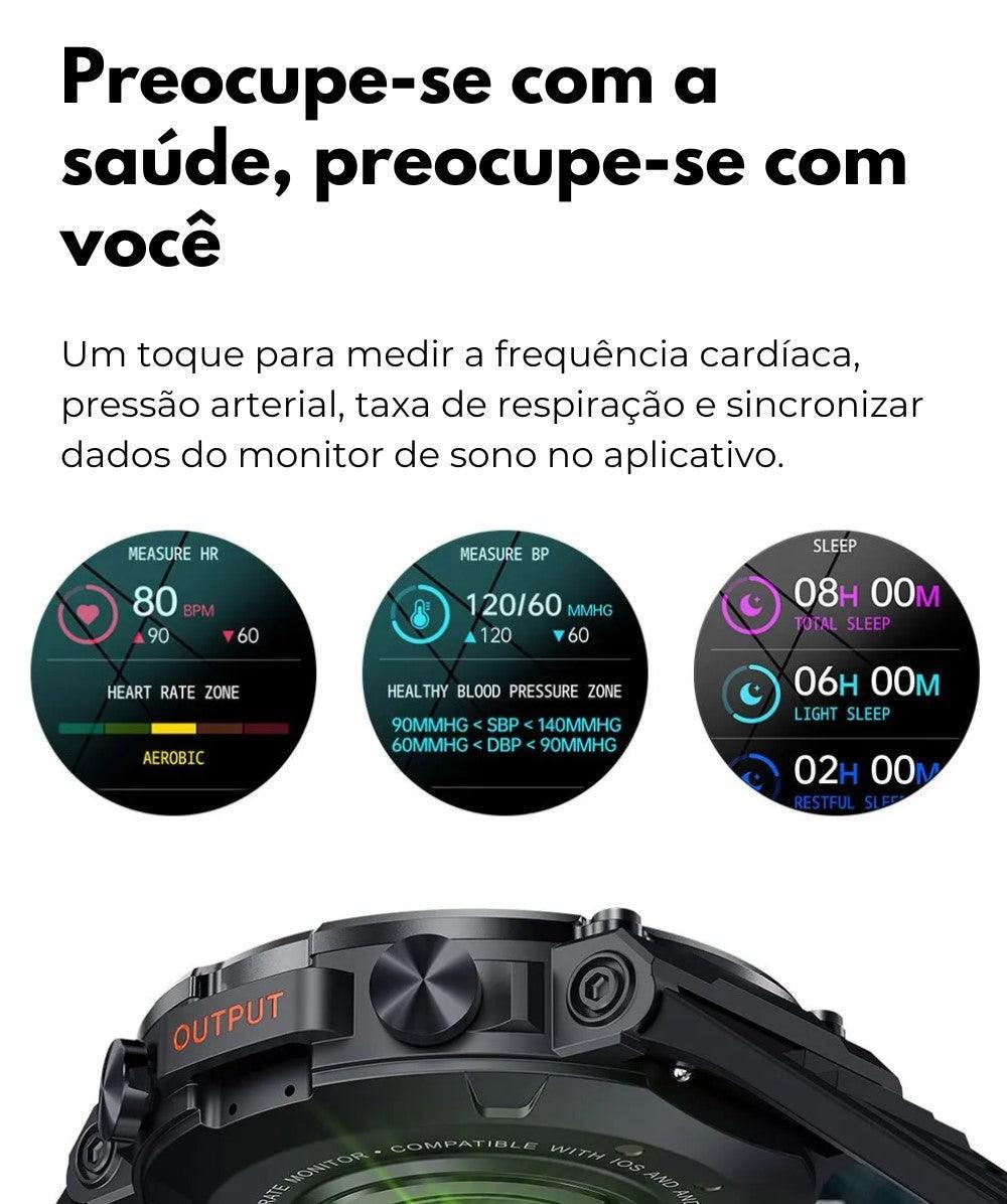 Vem com várias opções de idioma e suporte para funções de monitoramento de saúde.